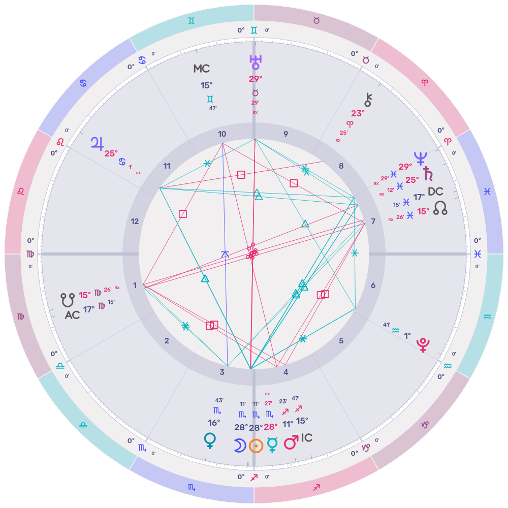 Aspect: Sun + Moon + Mercury Retrograde conjunct at 28° Scorpio